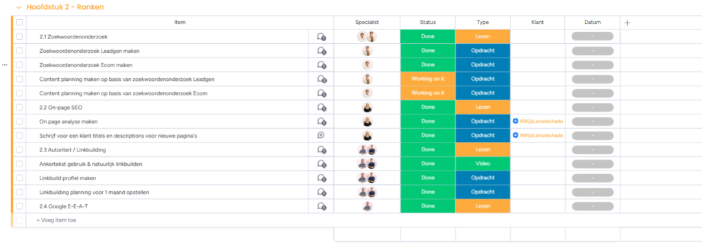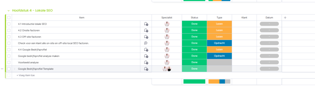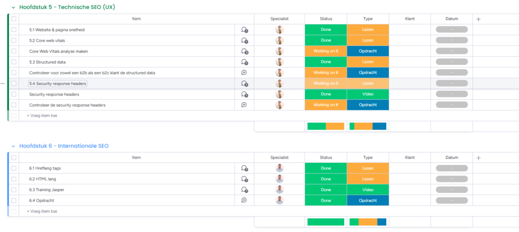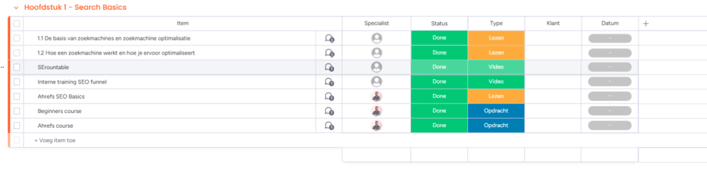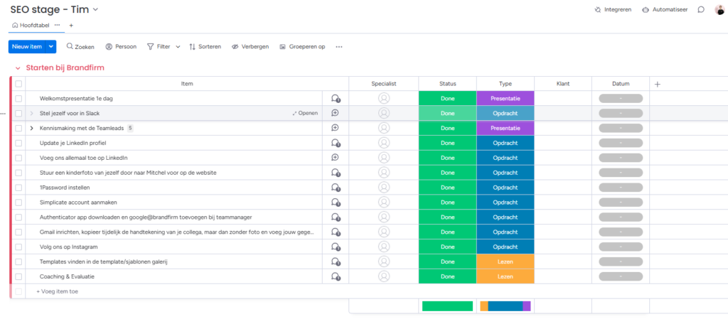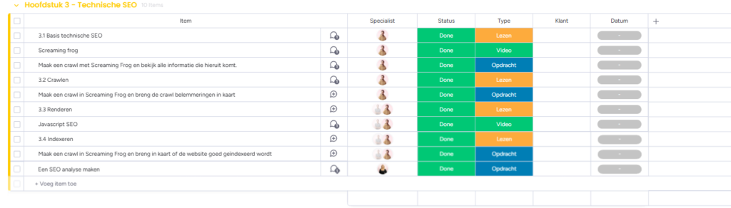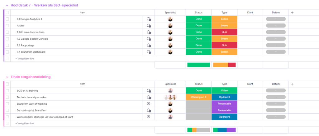 Tijden mijn stage bij Brandfirm heb ik ook ontzettend veel geleerd. Zoals ik in mijn video’s over mijn stageperiode vertel, had ik een heel dashboard die ik af kon lopen. Dat dashboard bestond uit alle verschillende onderwerpen binnen SEO om zo alles hierover te leren. Ik kon zelf afvinken als ik ergens klaar mee was. Uiteindelijk heb ik alles afgemaakt. Het dashboard zag er zo uit: